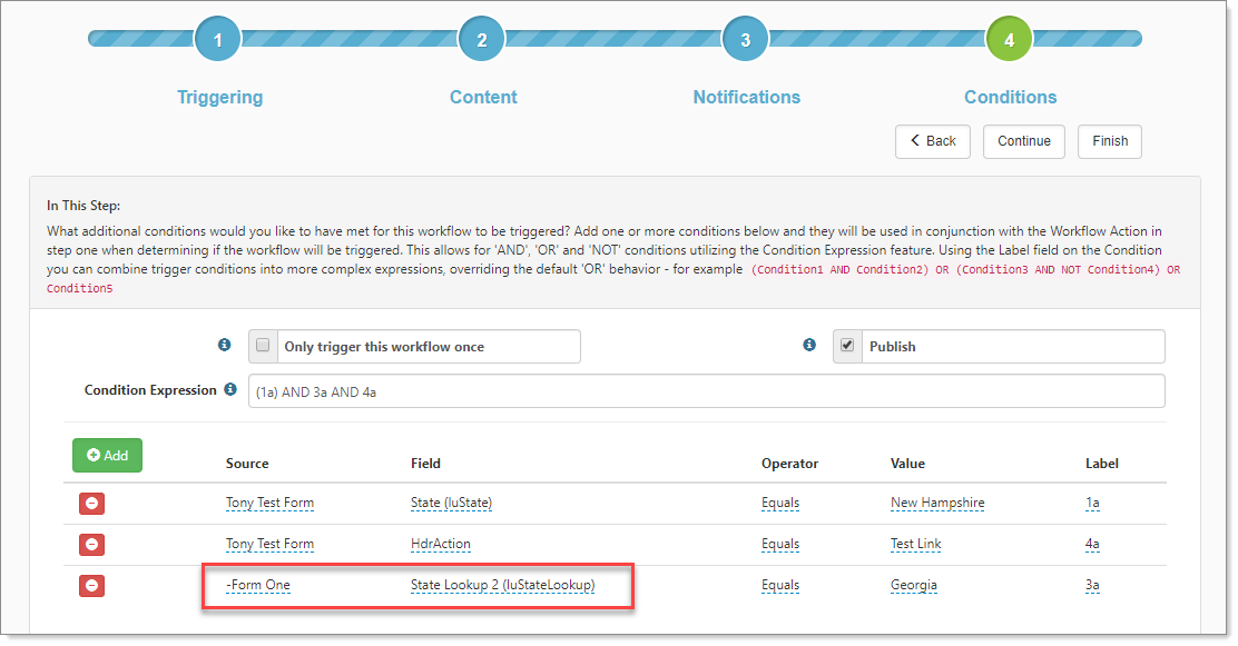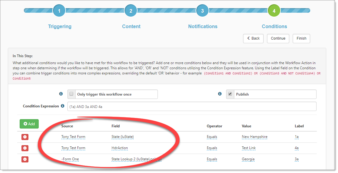 | • | If the most recent dataform is the main triggering dataform for the workflow, the condition Source is Channel Trigger: <NameOfTriggeringForm>. |