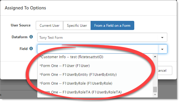The user type fields on workflow item tasks and dataforms include any child forms containing a user datatype field in a tabbed relationship with the available selected dataform when the user source option of From a Field on a Form is selected. The child form name has an asterisk, as in the following example: *Employee -- Project User (ProjectUser).