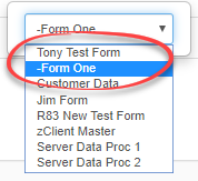 Example: The following example shows a parent form named Tony Test Form in the Dataform list. Tony Test Form is a parent form to Form One. When Tony Test Form is selected, the Field field displays all user-related fields from the parent form and child form. For Fields, you can select a field from the parent form (in this case Tony Test Form) or you can select fields from any child dataforms. Child forms are denoted with an asterisk (*), as shown in the following example.