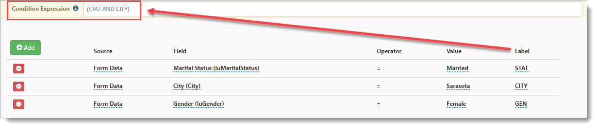 The following example has three Display Conditions: STAT, CITY, GEN. Two of the three Labels are used in the Condition Expression.