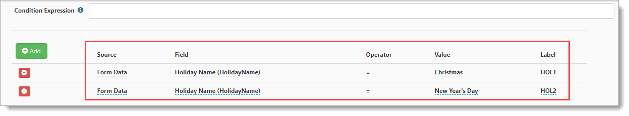 For forms that offer conditions, when you click Add (lower portion of the form), a row opens where you can assign values to within fields such as Source, Field, Operator, Value, and Label (see the following image). The values must correspond to what is stored in the database. For example, lookups would be the Code value, and for parent form fields, such as Case Type, the value would be the ID of the form.