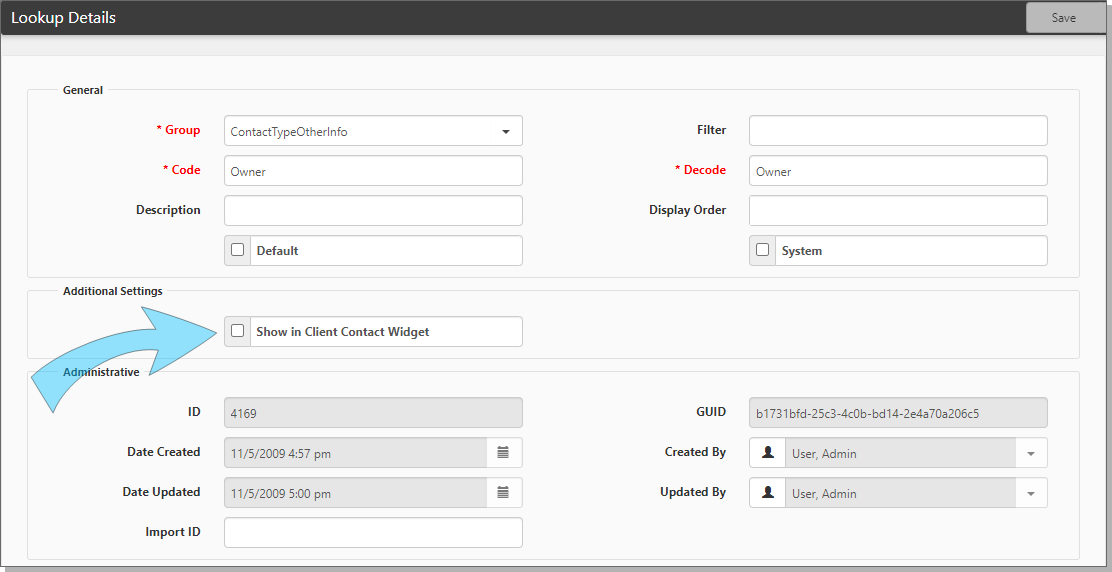 The Lookup Details form opens with the contact type you selected. - Select the option Show in Client Contact Widget.