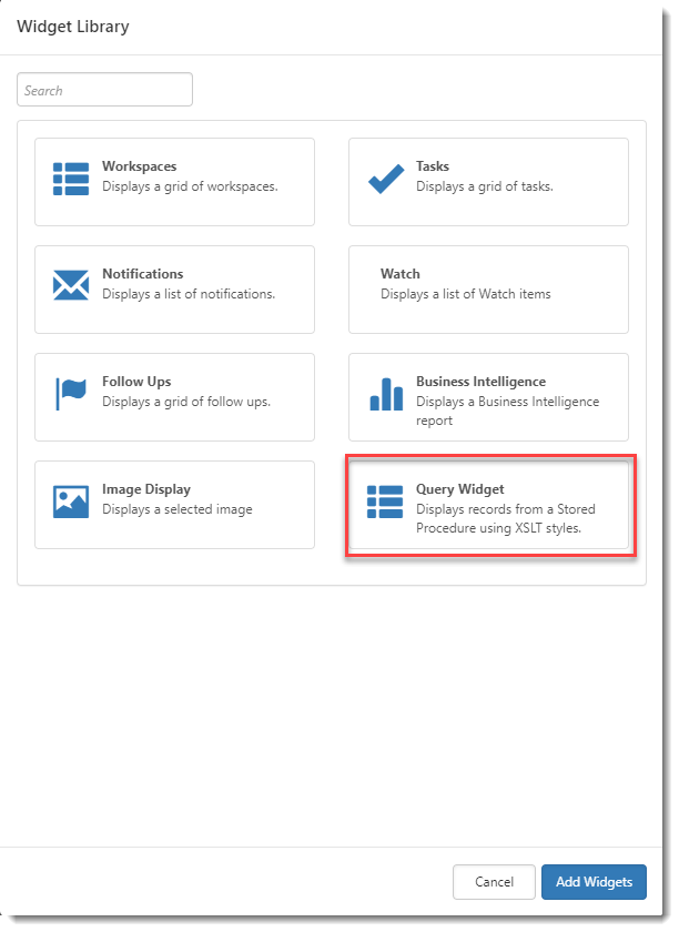 Click Query Widget and then click Add Widgets as shown in the example screen below: