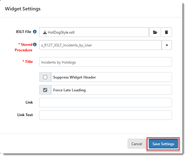 The Widget Settings window closes and you are returned to the Widget Layout Details window.